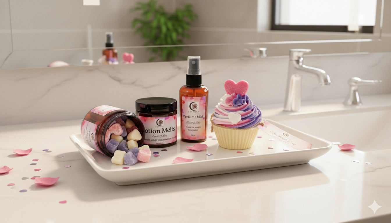 Disponible en jabón artesanal y también en su set a juego con lotion melts y perfume spray para una experiencia completa.
